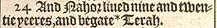 24 Und Nahor lebte neunundzwanzig Jahre und zeugte *Terah.[*Lukas 3:34 Thara]
