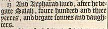 13 And Arphaxad liued, after he begate Salah, foure hundred and three yeeres, and begate sonnes and daughters.