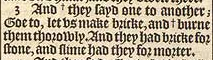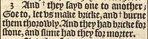 3 And +they sayd one to another; Goe to, let vs make bricke, and + burne them thorowly. And they had bricke for stone, and slime had they for morter. [+Heb. a man said to his neighbour. , +Heb. burne them to a burning.]