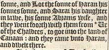 31 And Terah tooke Abram his sonne, and Lot the sonne of Haran his sonnes sonne, and Sarai his daughter in lawe, his sonne Abrams wife, and they went foorth with them from *Ur of the Chaldees, to goe into the land of Canaan: and they came vnto Haran, and dwelt there. [ *Nehem. 9.7. iudith. 5.7. acts.7. 4. ]