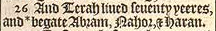 26 And Terah liued seuenty yeeres, and *begate Abram, Nahor, & Haran. [* Iosh.24.2 1.Chron.1. 26. ]