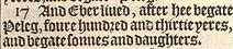 17 And Eber liued, after hee begate Peleg, foure hundred and thirtie yeres, and begate sonnes and daughters.