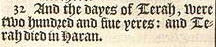 32 And the dayes of Terah, were two hundred and fiue yeres: and Terah died in Haran.