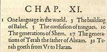 1 One language in the world. 3 The building of Babel. 5 The confusion of tongues. 10 The generations of Shem. 27 The generations of Terah the father of Abram. 31 Terah goeth from Vr to Haran.