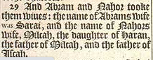 29 And Abram and Nahor tooke them wiues: the name of Abrams wife was Sarai, and the name of Nahors wife, Milcah, the daughter of Haran, the father of Milcah, and the father of Iscah.