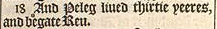 18 And Peleg liued thirtie yeeres, and begate Reu.