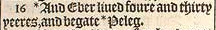 16 *And Eber liued foure and thirty yeeres, and begate * Peleg.[ *1.Chron. 1.19. , Called *Luke 3.35. Phalec.]