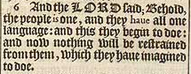 6And the LORD said; Behold, the people is one, and they haue all one language: and this they begin to doe: and now nothing will be restrained from them, which they haue imagined to doe.