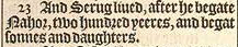 23 And Serug liued, after he begate Nahor, two hundred yeeres, and begat sonnes and daughters.