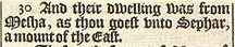 30 Und ihre Behausungen war ab von Mesha, wenn du nach Sephart gehst, einem Berg im Osten.