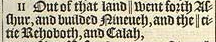 11 Out of that land || went forth Asshur, and builded Nineueh, and the || citie Rehoboth, and Calah, [ || Or, he went out into Assyria. , || Or, the streetes of the Citie. ]
