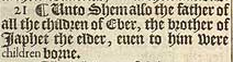 21 ¶ Unto Shem also the father of all the children of Eber, the brother of Iaphet the elder, euen to him were children borne.