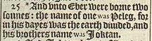 25 *And vnto Eber were borne two sonnes: the name of one was Peleg, for in his dayes was the earth diuided, and his brothers name was Ioktan. [ *1.Chron. 1.19.]