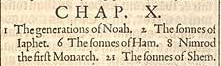 1 Die Ahnenreihe von Noah. 2 Die Söhne von Japhet. 6 Die Söhne von Ham. 8 Nimrod der erste Monarch. 21 Die Söhne von Sem.