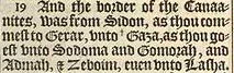 19 And the border of the Canaanites, was from Sidon, as thou commest to Gerar, vnto + Gaza, as thou goest vnto Sodoma and Gomorah, and Admah, & Zeboim, euen vnto Lasha. [ +Hebr. Azzah. ]