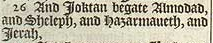26 And Ioktan begate Almodad, and Sheleph, and Hazarmaueth, and Ierah,