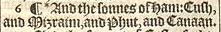 6 ¶ *And the sonnes of Ham: Cush, and Mizraim, and Phut, and Canaan.[*1.Chron. 1.8.]