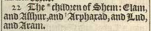 22 The *children of Shem: Elam, and Asshur, and +Arphaxad, and Lud, and Aram.[ *1.Chron. 1.17. , +Hebr. Arpachshad.]