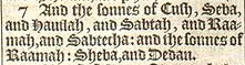 7 And the sonnes of Cush, Seba, and Hauilah, and Sabtah, and Raamah, and Sabtecha: and the sonnes of Raamah: Sheba, and Dedan.