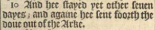 10 And hee stayed yet other seuen dayes; and againe hee sent foorth the doue out of the Arke.