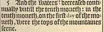 5 And the waters +decreased continually vntill the tenth moneth: in the tenth moneth, on the first day of the moneth, were the tops of the mountaines seene. [ +Hebr. were in going and decreasing.]