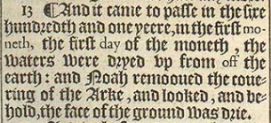 13 ¶And it came to passe in the sixe hundredth and one yeere, in the first moneth, the first day of the moneth, the waters were dryed vp from off the earth: and Noah remooued the couering of the Arke, and looked, and behold, the face of the ground was drie.