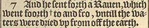 7 And he sent forth a Rauen, which went foorth +to and fro, vntill the waters were dried vp from off the earth. [Hebr. in going foorth, and returning.]