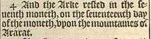 4 And the Arke rested in the seuenth moneth, on the seuenteenth day of the moneth, vpon the mountaines of Ararat.