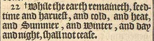 22 +While the earth remaineth, seed-time and haruest, and cold, and heat, and Summer, and Winter, and day and night, shall not cease. [+Heb. as yet all the dayes of the earth.]