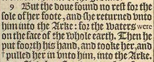 9 But the doue found no rest for the sole of her foote, and she returned vnto him into the Arke: for the waters were on the face of the whole earth. Then he put foorth his hand, and tooke her, and +pulled her in vnto him, into the Arke. [ +Hebr. caused her to come.]