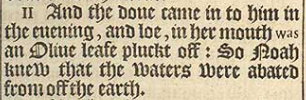 11 And the doue came in to him in the euening, and loe, in her mouth was an Oliue leafe pluckt off: So Noah knew that the waters were abated from off the earth.