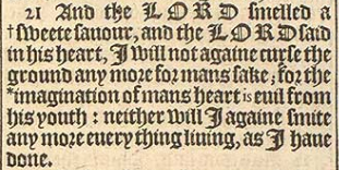 21 And the LORD smelled a +sweete sauour, and the LORD said in his heart, I will not againe curse the ground any more for mans sake; for the *imagination of mans heart is euil from his youth: neither will I againe smite any more euery thing liuing, as I haue done. [+ Hebr. a sauour of rest. , *Chap.6. 5. matt.15. 19.]