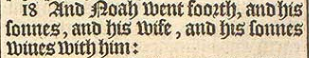 18 And Noah went foorth, and his sonnes, and his wife, and his sonnes wiues with him: