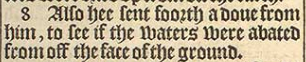8 Also hee sent foorth a doue from him, to see if the waters were abated from off the face of the ground.
