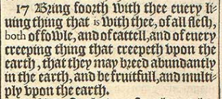 17 Bring foorth with thee euery liuing thing that is with thee, of all flesh, both of fowle, and of cattell, and of euery creeping thing that creepeth vpon the earth, that they may breed abundantly in the earth, and be fruitfull, and multiply vpon the earth.