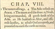 1 Die Wassermassen beruhigen sich. 4 Die Arche ruht auf Ararat. 7 Die Raben und die Taube. 15 Noah wird befohlen, 18 geht von der Arche. 20 er baut einen Altar und bringt Opfer dar, 21 das Gott akzeptiert und verspricht, die Erde nicht mehr zu verdammen.
