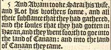 5 And Abram tooke Sarai his wife, and Lot his brothers sonne, and all their substance that they had gathered, and the soules that they had gotten in Haran, and they went foorth to goe into the land of Canaan: and into the land of Canaan they came.
