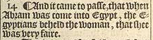 14 ¶ And it came to passe, that when Abram was come into Egypt, the Egyptians beheld the woman, that shee was very faire.