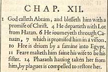 1 Gott ruft Abram und segnet ihn mit dem Versprechen von Christus. 4 Er verlässt Haran mit Lot. 6 Er reist durch Kanaan, 7 das ihm in einer Vision versprochen wurde. 10 Er wird von einer Hungersnot nach Ägypten getrieben. 11 Furcht veranlasst ihn, seine Frau als seine Schwester auszugeben. 14 Pharao nimmt sie von ihm, gibt sie wegen einer Plage zurück.