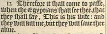 12 Therefore it shall come to passe, when the Egyptians shall see thee, that they shall say, This is his wife: and they will kill me, but they will saue thee aliue.