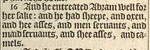 16 And he entreated Abram well for her sake: and he had sheepe, and oxen, and hee asses, and men seruants, and maid seruants, and shee asses, and camels.