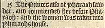 15 The Princes also of Pharaoh saw her, and commended her before Pharaoh: and the woman was taken into Pharaohs house.