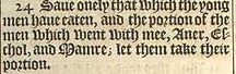 24 Saue onely that which the yong men haue eaten, and the portion of the men which went with mee, Aner, Eschol, and Mamre; let them take their portion.
