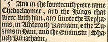 5 And in the fourteenth yeere came Chedorlaomer, and the Kings that were with him, and smote the Rephaims, in Ashteroth Karnaim, & the Zuzims in Ham, and the Emims in || Shaueh Kiriathaim;[ || Or, the plaine of Kiriathaim.]