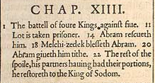 1 Die Schlacht der vier Könige gegen fünf. 11 Lot wird gefangen genommen. 14 Abram rettet ihn. 18 Melchizedek segnet Abram. 20 Abram gibt ihm den Zehnten. 22 Der Rest der Beute gibt er, nachdem seine Partner ihren Anteil bekommen hatten, dem König von Sodom.