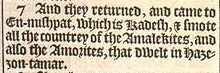 7 And they returned, and came to En-mishpat, which is Kadesh, & smote all the countrey of the Amalekites, and also the Amorites, that dwelt in Hazezon-tamar.
