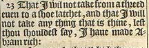 23 That I wil not take from a threed euen to a shoe latchet, and that I will not take any thing that is thine, lest thou shouldest say, I haue made Abram rich: