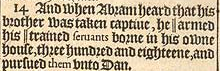 14 Und als Abram hörte, dass sein Bruder gefangen genommen wurde, ||bewaffnete er dreihundertachtzehn ||trainierte Diener aus seinem eigenen Haus und jagte sie Dan nach.[||oder: entsandte ||oder: instruierte]
