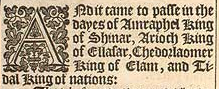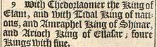 1 And it came to passe in the dayes of Amraphel King of Shinar, Arioch King of Ellasar, Chedorlaomer King of Elam, and Tidal King of nations: