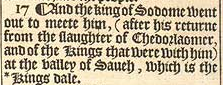 17 ¶ And the king of Sodome went out to meete him, (after his returne from the slaughter of Chedorlaomer, and of the Kings that were with him) at the valley of Saueh, which is the * Kings dale.[*2.Sam.18. 18. ]